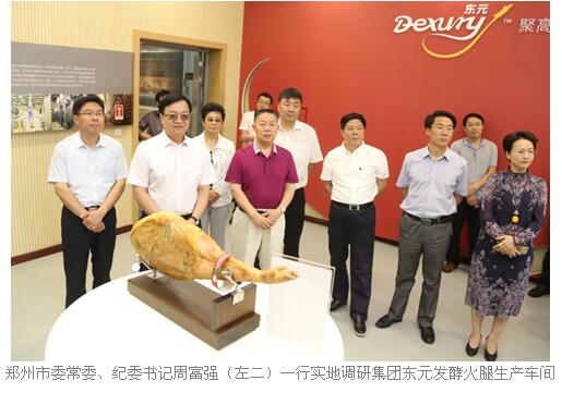 5月23日,郑州市委常委、纪委书记周富强一行在新郑市委书记刘建武、纪委书记徐卫东等领导的陪同下,调研雏鹰农牧集团东元发酵火腿生产车间,听取集团党委书记、董事长侯建芳对公司规划、建设及生产情况方面的汇报,陪同调研的领导还有集团总裁李花、党委副书记丁美兰等。