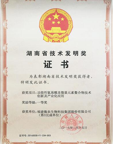 日前,在湖南省科技奖励暨创新奖励大会上,由中国科学亚热带农业生态研究所、福建傲农生物科技集团股份有限公司等单位共同完成的“功能性氨基酸及微量元素螯合物技术创新及产业化应用”项目荣获2016年度“湖南省技术发明奖”一等奖。