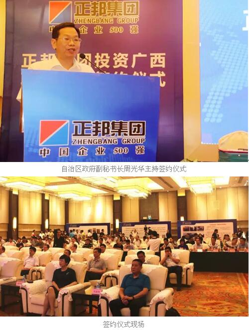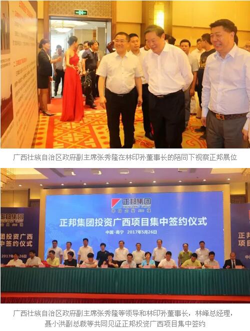 5月26日,正邦大举投资广西项目集中签约仪式在南宁召开,广西壮族自治区政府副主席张秀隆,自治区政府副秘书长周光华等领导,以及正邦集团董事长林印孙,正邦科技总经理林峰,正邦集团副总裁聂小洪等出席并共同见证签约。