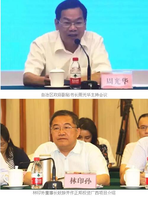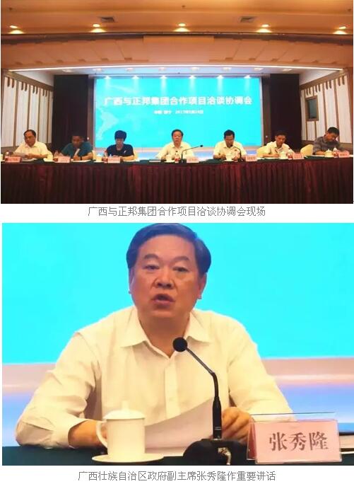 5月26日,广西壮族自治区政府在南宁组织召开广西与正邦集团合作项目洽谈协调会。自治区政府副主席张秀隆出席并作重要讲话,自治区政府副秘书长周光华,自治区发展改革委、工业和信息化委、财政厅、环境保护厅、国土资源厅、农业厅、林业厅、投资促进局、农垦局、工商局、金融办、扶贫办、监狱管理局、水产畜牧兽医局等区直有关部门负责人,南宁、桂林、玉林、河池、来宾市分管负责人,相关县(区)或单位的分管负责人,以及正邦集团董事长林印孙,正邦科技总经理林峰、正邦集团副总裁聂小洪等高管出席。