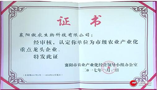 为充分发挥新常态下龙头企业的示范引领作用,推动农业产业化经营提档升级,促进现代农业强市建设,根据《襄阳市农业产业化市级重点龙头企业认定和监测管理办法》(襄农产字〔2004〕7号)的规定,去年年底,襄阳市农业产业化领导小组办公室组织开展了市级农业产业化重点龙头企业监测(申报)认定工作。近期,经襄阳市发改委、市财政局、市商务局、中国人民银行襄阳支行、市国家税务局、市环保局、市农委、市畜牧局等八个部门专家联合评审,襄阳傲农生物科技有限公司顺利通过认定,荣膺“襄阳市农业产业化重点龙头企业”称号,有效期两年。