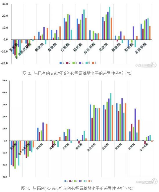 此外,本文将这6个品牌的南美白对虾饲料与已有的文献报道的、赢创推荐的必需氨基酸水平(见图1)分别进行了差异性分析(见图2和图3)。这些差异性分析结果表明,南美白对虾商业饲料的必需氨基酸模式普遍存在着不平衡现象,由于氨基酸的作用存在短板效应,任何一种必需氨基酸的缺乏都将影响蛋白质的合成,所以,氨基酸平衡是蛋白质高效利用的基础,氨基酸不平衡就会降低蛋白质效率,从而导致对虾的生长较差。此外,当蛋氨酸缺乏时,会引起食欲减退、生长减缓、白内障、肾脏肿大和肝脏铁堆积等现象,最后导致肝坏死或纤维化(Ruchimat等,1997;Sveier等,2001)。图2、3也显示出各品牌的蛋氨酸水平都没有满足对虾的需求,平均缺乏程度达10%-20%。这将成为商业饲料中的限制性氨基酸,不仅会影响对虾的生长和饲料利用,也会造成其它必需氨基酸的浪费,需要引起大家的重视。