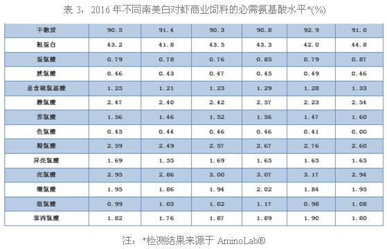 笔者在2016年对市场上6种不同品牌的南美白对虾商业饲料进行了调查分析,发现各品牌的饲料蛋白水平均高达40%以上,蛋氨酸含量为0.76%-0.87%(胱氨酸含量为0.43%-0.49%),赖氨酸含量为2.23%-2.57%,其它各必需氨基酸水平见表3。