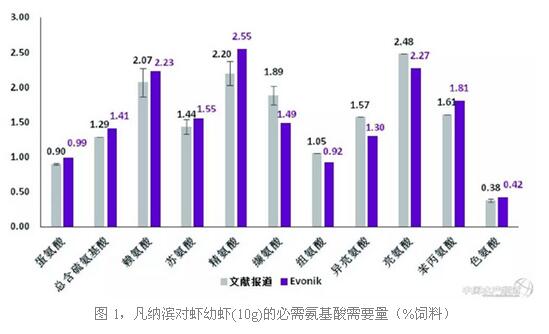 近20年来(1995-2015),国内外学者已经开展了一系列南美白对虾必需氨基酸营养需求的研究,极大的丰富了对虾营养学和对虾饲料研发的理论体系。图1列出了凡纳滨对虾幼虾(0.104-0.63g)的必需氨基酸需要量(%饲料)的主要研究结果,评价指标均为生长表现(增重率)。氨基酸需要量的确定一般是采用梯度剂量法,通过在试验饲料中添加不同梯度的待测晶体氨基酸,试验结束后根据生长反应曲线求得氨基酸最适添加量。如怀明燕(2009)、刘福佳(2014)通过以鱼粉、小麦面筋蛋白或花生麸、磷虾粉为主要蛋白源,在饲料中添加不同水平的待测氨基酸,对增重率进行回归分析,从而获得南美白对虾对这10种必需氨基酸的最适需要量。由此可见,南美白对虾能够有效地利用外源晶体氨基酸,饲料中额外添加晶体氨基酸能够有效地改善其生长、饲料利用及存活率。赢创(Evonik)对南美白对虾(1-10g)的必需氨基酸推荐量见图1。