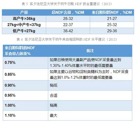 瘤胃功能 瘤胃微生物蛋白的必需氨基酸组成是最接近乳蛋白中必 需氨基酸组成(NRC2001),所以健康的瘤胃会产生大量的瘤胃微生物,通常会供给泌乳牛需要代谢蛋白的50%以上。要维持健康的瘤胃,关键是日粮NDF水平的控制。宾夕法尼亚大学根据不同的日粮结构给出了很好的建议,值得参考(表5,表6)。