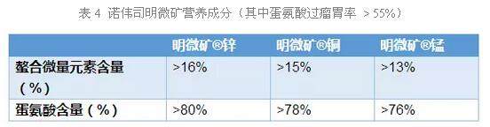 过瘤胃蛋氨酸 在中国的法规下(反刍动物饲料不能使用动物源性饲料),代谢蛋白中蛋氨酸很难提高到2.0%MP以上,所以经常会 用到过瘤胃保护性蛋氨酸。诺伟司国际公司最新研发的蛋氨酸螯合 微量元素明微矿,蛋氨酸含量高(见表4),并且过瘤胃率也高, 可同时作为有机微量元素和过瘤胃蛋氨酸使用,具有非常好的性价 比。如果用明微矿来取代日粮中NRC建议的无机微量元素水平的一 半(锌640mg,锰390mg,铜160mg),明微矿添加量分别为明 微矿锌4g/头/天,明微矿锰3g/头/天,明微矿铜1g/头/天,则不 仅有机微量元素的水平达到最佳,代谢蛋白中蛋氨酸水平也可以超 过2.0%MP。但其缺点是,如果我们以提高乳蛋白为目的,我们不 能过多添加明微矿(因为微量元素会超标),而需要选择添加其它 来源的过瘤胃蛋氨酸补充所需要的缺口。