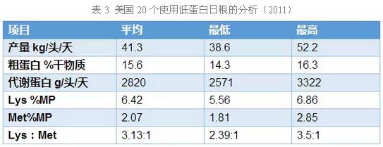 Van Amburgh(2011)的 webinar 讲座中总结了美国20个使用 低蛋白日粮奶牛场的日粮蛋白和氨基酸情形(表3)。从中可以看出平均赖氨酸和蛋氨酸水平分别为2.07%MP和6.42%MP。本人认 为,在做配方时不以提高乳蛋白为目的,而是以提高蛋白利用率为目的,这个比例是我们值得参考的。