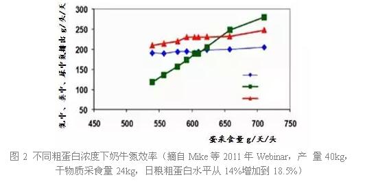 粗蛋白 当乳蛋白低的时候,很多人都有想提高日粮粗蛋白的冲动。实际上日粮粗蛋白的水平与乳蛋白含量相关性并不大。代谢蛋白合成乳蛋白的效率并不是一成不变的,在最高可达 77%,并且随着代谢蛋白的供应增加而降低,而且与能量相关(Metcalf 等2008),而NRC2001假设效率为67%,而CPM 3.0.8.1假设为65%。理论上粗蛋白转化为乳蛋白的效率可达40%-45%(Mike,2011),而在实践中,日粮粗蛋白超过17%时,效率只有24.7%(Hristov 2004b)。