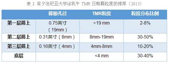 表2是宾州大学的最新推荐值(2013),TMR日粮颗粒达到这种分布是非常理想的。但在实践中由于饲料条件的限制,很难达到,所以不同的人提出了不同的颗粒分布比例。但很多人仅关注第一层的比例,有8-12%,10-15%等建议。 但本人为,每个牧场的饲料条件不同,建立适合自己的标准非常关键,在做自己的标准时更应该关注最下层的比例,在控制最下层不超过40%(4mm筛)的条件下,尽可能减少上层比例,不低于2%。一旦建立自己的标准,即必须经常监控,使每天日粮颗粒分布变异最小化。