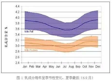环境温度(热应激)环境温度对乳蛋白含量的影响主要表现在热应激方面。Bailey 等(2005)报导牛群乳蛋白含量每年呈季节性变化,夏季最低(见图1)。