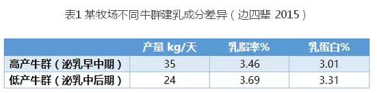 奶牛生理状态 Khazaei等(2008)的研究表明奶牛的生理状态,如胎次,泌乳天数等显著影响乳蛋白含量。乳蛋白含量在产后20-50天最低,在泌乳后期(250天)产量降低的阶段达到最高值。胎次也影响乳蛋白含量,随着胎次的增加,产量升高及乳腺感染的增加而降低(Jud Heinrichs等 2005)。本人跟踪了一个牧场一个多星期(2015)的结果也发现泌乳前期牛的乳脂,乳蛋白显著低于泌乳后期牛(这个牧场牛群分高产牛和低产牛,不同挤奶台挤奶),结果见表1。当牧场有多套挤奶设备,并且泌乳牛按产量/泌乳阶段分群,并且用不同的奶车装运时要注意,否则可能高产牛群的乳蛋白过低而被压价,解决方法是装车之前先混合。