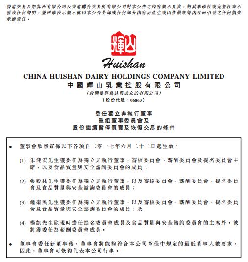 辉山乳业发布公告,朱健宏获委任为独立非执行董事,审核委员会、薪酬委员会及提名委员会主席,以及食品质量与安全咨询委员会的成员;张毅林及钟卫民获委任为独立非执行董事,以及审核委员会、薪酬委员会、提名委员会及食品质量与安全咨询委员会的成员;及杨凯除现时担任提名委员会成员及食品质量与安全咨询委员会的主席外,彼将获委任为薪酬委员会成员。