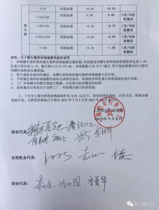 按照本市生鲜乳价格协商机制规定,经由上海奶业行业协会召集市奶农代表与光明乳业代表三方充分协商,鉴于当前全国各地奶价和牛奶消费市场情况,奶农和乳企双方达成一致意见。2017年下半年上海生鲜乳收购基础价为3.75元/公斤,原有的理化指标、计价方式、牧场分级奖励等方案保持不变。生鲜乳价格执行日期从2017年7月1日—2017年12月31日。