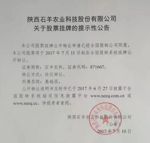7月11日,陕西石羊农业科技股份有限公司成功在全国股转公司挂牌(股票简称“石羊农科”、股份代码“871667”),成功登陆资本市场,成为新三板挂牌公众公司!