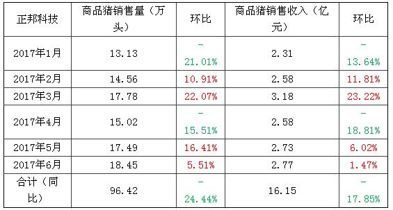 正邦科技7月10日晚间公告,公司2017年6月销售生猪18.45万头,环比增长5.51%,同比增长11.66%;销售收入2.77亿元,环比增长1.47%,同比下降7.16%。今年1-6月公司累计销售生猪96.42万头,同比下降24.44%;累计销售收入16.15亿元,同比下降17.85%。