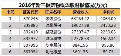 宏观来讲,2016年全行业整体盈利能力较强,依依股份、瑞鹏股份、路斯股份等6家新三板那宠物概念股全部实现盈利。值得一提的是,依依股份2016年业绩位居行业首位。