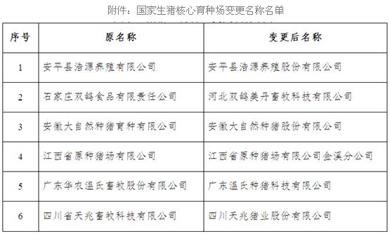 近一个时期以来,部分国家生猪核心育种场单位名称、生产经营等情况发生重大变化。根据《国家生猪核心育种场管理办法(试行)》有关规定,经对企业进行核实,决定对原安平县浩源养殖有限公司等6家国家生猪核心育种场单位名称进行变更(见附件);河北旺族种猪有限公司、湖南正虹科技发展股份有限公司正虹原种猪场、湖北省正嘉原种猪场有限公司鄂州原种猪场等3家企业,不能正常开展种猪性能测定等育种工作,决定取消其国家生猪核心育种场资格。