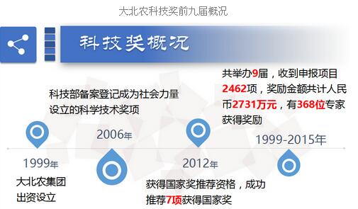大北农科技奖是1999年大北农集团出资设立的,已成功举办九届,前九届共收到申报项目2462项,奖励金额共计人民币2731万元,有368位专家获得奖励。