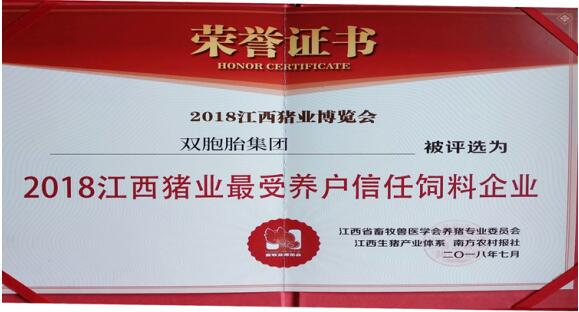 近日,在江西省畜牧兽医学会养猪专业委员会、江西生猪产业体系和南方农村报社主办的江西猪业博览会上,公布了改革开放40年江西猪业最受养殖户信任饲料企业评选结果,双胞胎集团再次荣获“2018江西猪业最受养户任饲料企业”称号,这是双胞胎连续三年获此殊荣。
