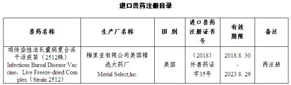 根据《兽药管理条例》和《兽药注册办法》规定,经审查,批准梅里亚有限公司美国精选大药厂生产的鸡传染性法氏囊病复合冻干活疫苗(2512株)在我国再注册,核发《进口兽药注册证书》,并发布修订后的产品质量标准、说明书和标签,自发布之日起执行。此前发布的该产品兽药质量标准、说明书和标签同时废止。 特此公告。 附件:1、进口兽药注册目录 2、质量标准 3、说明书和标签