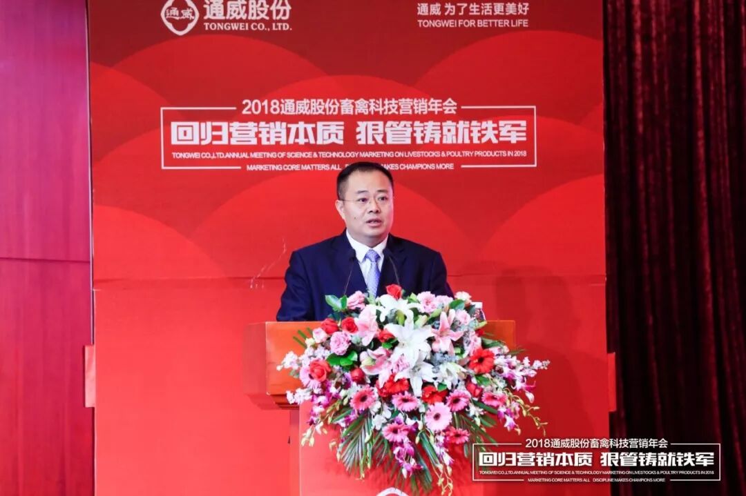 随后,通威股份畜禽营销总监喻明波在主题报告中回顾了2018年畜牧行业剧烈变化带来的多种新常态并存局面,伴随散养户的深度淘汰,自繁自养型家庭农场进入新一轮增长期。喻总在报告中详细分析了通威畜禽发展中的困惑,提出以质量领先的差异化产品和生产总成本领先作为农牧企业生存的关键指标,并借海南通威的成功案例说明通威畜禽营销不缺创新和方法,强调通威畜禽发展需要技术自信和营销自信,更需要总经理的深度参与。期间,全体畜禽营销将士振臂高呼“通威畜禽,大有可为”的口号,展现出畜禽业务发展的自信和担当,为公司在新一轮市场竞争中抢占先机积蓄力量。