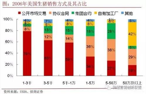 美国:生猪销售大多被合同锁定,专注于生产 随着生猪养殖规模化的提高,屠宰场开始与大型养殖场签订行销合同,公开透明,交易高效并且有助于双方规避价格风险。