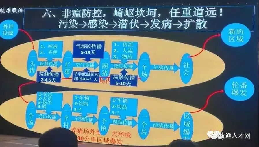 图/网络 上周,牧原股份董事长秦英林先生,分析了猪场感染发病的高风险因素,按控制难度系数分类,解释并总结了大多数人对传播途径的疑问,其中饲料污染对养猪业的危害是毁灭性的。 1饲料污染对养猪业的危害是毁灭性的 饲料环节多,控制难度系数大,结合近来几起规模猪场的疫情,小编个人观点,这也许是大规模场内同时多点散发的主要原因。 对此,秦英林董事长也分享,可采取的防控措施有如下七点: ①停用麸皮、米糠、DDGS以及“玉米+豆粕”为主原料; ②对所有玉米实施烘干灭菌。表面温度80°C,维持20分钟以上; ③改造制粒工艺,实施二次案灭菌; ④提高制粒温度到85°C以上,时间20分钟以上; ⑤饲料运输车不进场,实施饲料到场中转; ⑥把饲料制粒机搬到养猪场内,一个场一台制粒,新建288个站。 ⑦饲喂。厂内加工机组用管网,“密闭输饲料送到料槽”。 2新传播途径?防非瘟,你还会投入多少资金? 图/网络 那么病毒是怎么通过感染一头猪到整个区域大爆发?在上图可找到答案的同时,有设想过可以通过气溶胶传播吗? 如果设想成立,在环境病毒量如此大的环境下,我们养猪业超90%以上都没有空气过滤系统的,先不说这个系统,光防蚊虫蝇鼠类、购买专用车和建立清洗消高温烘干中心,就已经够我们养殖户去投资。 今年对于很多猪场而言,活下去一要面对非瘟,还要面对资金的问题,那么对于可能或已经出现的停工潮、裁员潮,就可以理解了。 2019养猪路,且养且珍惜。生死存亡之际,希望大家都能坚持到黎明,而不是耗尽资金倒在坚持的路上。