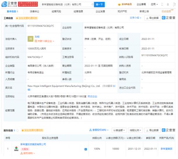 企查查APP显示,1月11日,新希望智能设备制造(北京)有限公司成立,法定代表人为刘栩,注册资本1亿元人民币,经营范围包含:工业机器人制造;服务消费机器人制造;特殊作业机器人制造;半导体分立器件制造等。 企查查股权穿透显示,该公司由新希望投资集团有限公司100%控股。