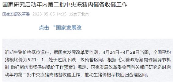 近期生猪价格低位运行,据国家发展改革委监测,4月24日~4月28日当周,全国平均猪粮比价为5.21:1,处于过度下跌二级预警区间。根据《完善政府猪肉储备调节机制 做好猪肉市场保供稳价工作预案》规定,国家发展改革委会同有关部门研究适时启动年内第二批中央冻猪肉储备收储工作,推动生猪价格尽快回归合理区间。