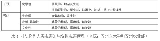 为了控制蝇和其他虫害的数量,有一个全面综合性的虫害管理(1PM)方案建议用于所有的家畜设施。表1阐述了该综合性虫害管理方案如何采用全面的方法对虫害进行管理的,最大的重点放在用强化的其他工具和商业性产品的预防管理上。