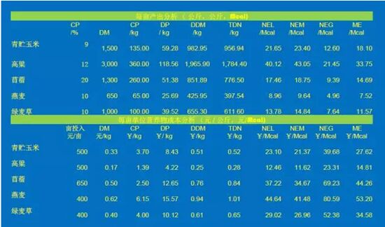 还是按这个方法计算每亩的产量,比如玉米、高粱是500块钱,苜蓿650块钱,燕麦400块钱,绿麦草400块钱的生产投入来核算的话,不算地价,也会算出来每亩地要生产出来的干物质,折合成每公斤是多少钱,那么最便宜的0.17,那就是甜高粱。