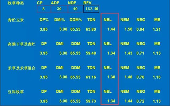 总可消化养分TDN跟蛋白质CP、酸洗纤维ADF与粗纤维有极大的关系,知道了ADF、粗蛋白,通过这些公式就可以计算出总的可消化营养物是多少。还有用其它公式,我们也可以套算模拟一个实验,可以看出来高粱干草及青贮的产能净能是1.34,青贮玉米的产能净能是1.44,紫花苜蓿的产能净能是1.34,禾草的产能净能是1.38,所有牧草就是这几个数字。这一列数字可以看出来差别不是很大,和青贮玉米没有多大差别,但因为营养体农业产量很高,所以这种情况下牧场选择更多的饲料源来饲喂奶牛就更方便。