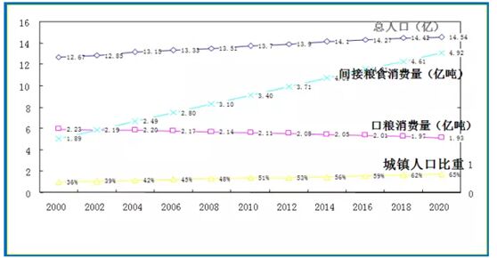 城镇人口的比例从2000年的36%,按照国家规划到2020年达到70%,这个速度是在加快的。间接的粮食消费主要从2000年的1.8亿吨一直到4亿吨,人口总量估计到14亿,在这种情况下实际人吃的粮食稳定在2亿吨左右,历任的农业部长都在搞粮食增产,以粮为纲这个理念非常深。按照城镇化的比例可以算一笔帐,如果按照14亿人来说,咱们现在农村的人口吃的口粮大概230~240公斤左右,城镇人口是80公斤,一个农村人口要吃掉城镇人口3倍的粮食。按照2003年的生活水平来计算,很多农民进城以后,他的口粮也会降下来,降的结果是到2020年的时候虽然人口在增加,但我们的口粮不会增加反而会减少,就是1:3的关系。