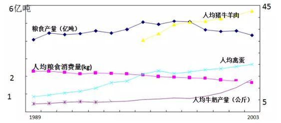 若保持14年来年均节约口粮数(32.14亿公斤)、年均新增人口速率(1179万人)不变(据国家计生委2003年人口预测结果,2004年以后每年新增人口数在600~1000万之间),每年节约的口粮数大大高于每年新增人口对口粮的需要量。而城镇人口口粮消费则更进一步由1989年的133.9公斤下降到2003年的79.5公斤,下降了40.63%,为全国平均口粮的约1/2。与此同时,动物食品的消费量成倍大幅上升,可以说这是我国史无前例的动物性食物“大跃进”,这就表明动物性食物在我国食物资源中所占比重迅速增加。