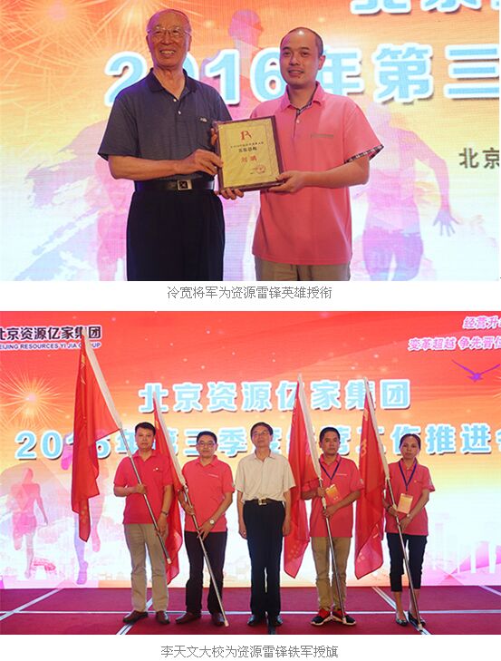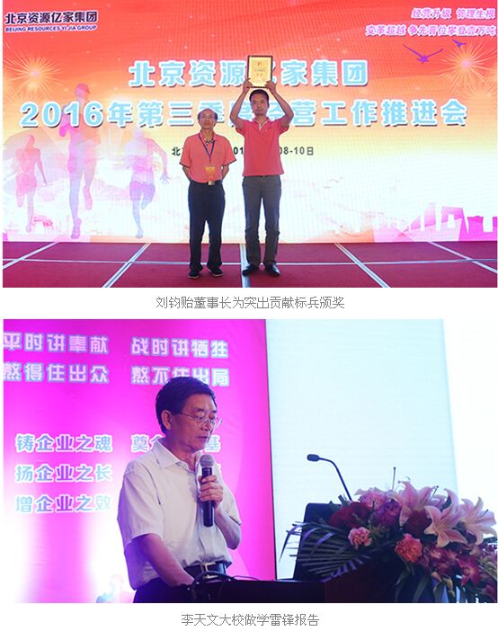 7月8—10日,以"变革超越"和"争先晋位"为关键词,北京资源亿家集团2016年第三季度经营工作推进会,在"首善之地"北京大兴区魏善庄久峰月季国际酒店隆重而胜利召开。海军原副政委、中国社会福利基金会学雷锋基金管委会名誉主任、中华雷锋文化促进会名誉会长冷宽中将,中国社会福利基金会学雷锋基金管委会、中华雷锋文化促进会副会长兼秘书长李天文大校等贵宾出席大会。集团高层领导、各板块公司和职能部门主要负责人等共200余人参加大会。
