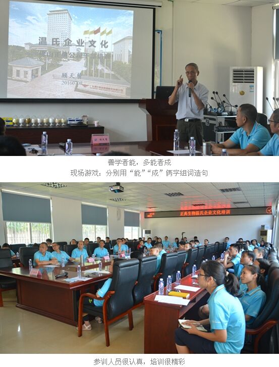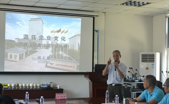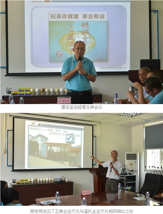 顾天赞老师以温北英先生的“发挥自身的能力,于社会有点作为”为主线,选取其“善学者能,多能者成”在个人成长、企业发展的事例,介绍了温北英思想与企业发展,向大家讲述了集团的发展历程,通过引用鲜活的事例典故向大家呈现了温北英等集团先辈及现任领导们创业初期不为大众所知的艰辛历程,展现了温氏文化的核心理念,同时对新时期温氏干部的“三个要”,温氏文化的新表现“五个更”和温氏“百年企业千亿企业” 内涵作了解析。最后点出了正典企业文化与温氏企业文化相同相似之处。