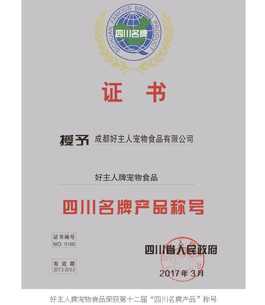 好主人牌宠物食品荣获第十二届“四川名牌产品”称号