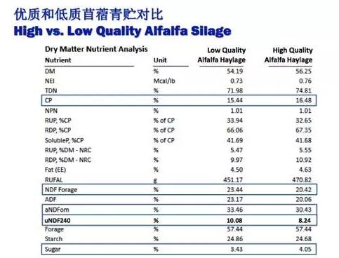 牧草管理 优质牧草是高产量的保证,苜蓿青贮。玉米青贮,换成低质饲料的话,需要提高纤维消化率来获得相同的产奶量,副产品和菜粕的饲喂比例更高。