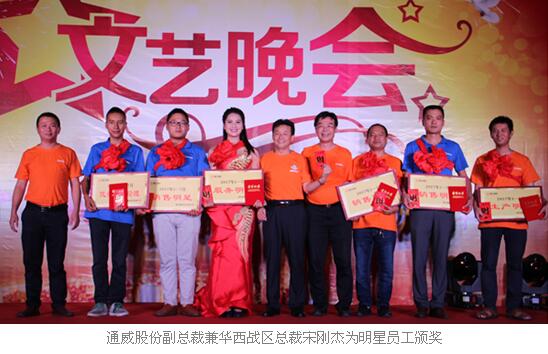 晚会上,重庆通威举行了2017年1-7月明星员工表彰活动,来自市场部的业务主办金洁荣获了后勤体系的“服务明星”,生产部中控室郑述均获得了“生产明星”,水产料部王刚、王坤、畜料部杨永成、禽料部周斌成获得了“销售明星”。通威股份副总裁兼华西战区总裁宋刚杰、重庆通威总经理孙庆高、副总经理夏建强为他们颁发荣誉证书、佩戴红花,并勉励再接再厉,再创佳绩。