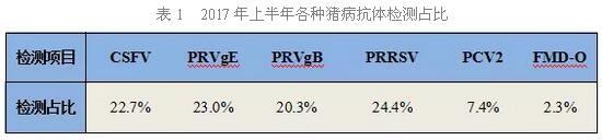 1、抗体检测 2017年上半年主要进行了CSFV、PRV gE、PRV gB、PRRSV、PCV2、FMD-O型等6种病原的抗体检测,其中PRRSV和PRV gE的抗体检测占比较大(见表1),说明临床上对这两种疫病的免疫效果及感染风险关注度较高。