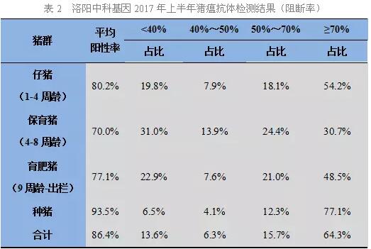 1.1、猪瘟抗体检测 送样进行CSFV抗体检测的目的主要是评价疫苗免疫后效果。2017年上半年,CSFV抗体的总阳性率为86.6%。对有明确的背景信息的样品进行统计,阳性率为86.4%。表明猪瘟抗体水平稳定,处于免疫合格范围内;其中仔猪与种猪的平均阳性率高于其他阶段的猪群,保育猪和育肥猪在“阻断率≥70%”的区间内所占的比例明显低于其他阶段。从猪瘟疫苗免疫阴性猪的抗体上升情况看,原因可能为首免甚至二免时,因母源抗体较高,由于受母源抗体干扰,抗体呈现不升反降,仔猪与种猪平均阳性率较高的结果也从另一侧面佐证了这一点。因此,对于这样的场,我们会提醒其关注免疫程序的合理性,通过持续监测调整免疫程序,提高群体免疫效果。