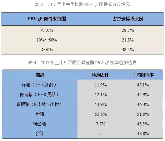 目前,几乎所有场免疫的均为PRV gE缺失疫苗,送检PRV gE抗体主要目的是监测猪群感染状况和进行PRV净化。2017年上半年对监测PRV gE抗体的猪群进行统计,群体阳性率为77.2%;其中阳性群体中gE平均阳性率高于50%的群体占总检测群体的48.5%(见表3),表明解决猪伪狂犬感染及净化问题仍是猪场当前的重点工作。