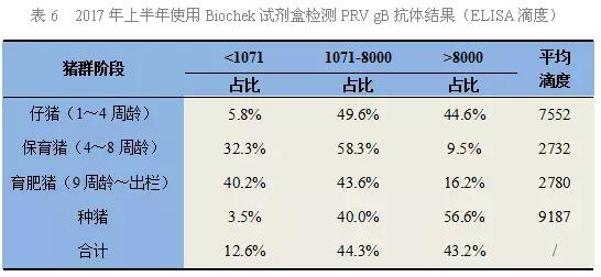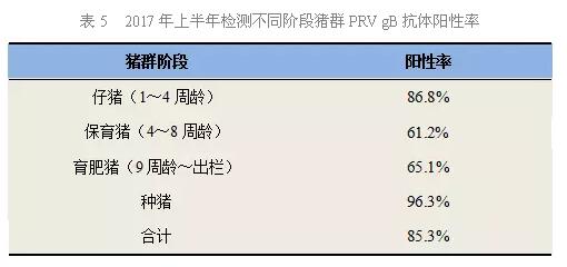 送检PRV gB抗体,主要关注的是疫苗免疫效果和免疫程序是否合理,因此我们在检测试剂使用上,前期选择了经评价与免疫保护相关性较高的荷兰BioChek PRV gB抗体检测试剂盒,后期经用普莱柯万泰试剂盒与该试剂盒进行了多批次平行比对检测,证实两者结果相仿后,改用普莱柯万泰试剂盒检测。2017年上半年,PRV gB抗体的阳性率为82.6%。对有明确的背景信息的样品进行统计,阳性率为85.3%,总体阳性率较高。对有明确背景信息的样品的检测结果进行了统计,结果见表5。