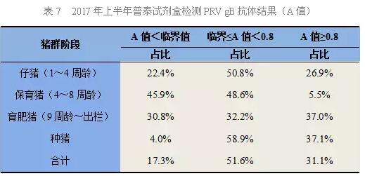 对使用普莱柯万泰PRV gB试剂盒检测的结果进行了统计,阳性率为76.3%;对有明确背景信息的样品进行了统计,阳性率为82.7%,结果见表7。结果显示,对于不同阶段的猪群,其A值处于临界值~0.8范围(正常免疫抗体)的样品所占的比例均未超过60%,说明伪狂犬疫苗的免疫效果并未达到理想水平。而在“A值≥0.8”(即猪伪狂犬病感染预警值)范围内,种猪与育肥猪的比例均在35%以上,说明育肥猪和种猪中的伪狂犬感染的风险仍然很大。