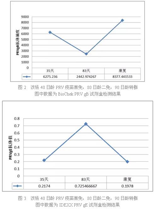 另外,对不同阶段猪群的检测结果进行分析发现,不论是BioChek检测结果,还是普泰试剂盒检测结果,从仔猪到保育、育肥的整个阶段,抗体滴度呈先下降,后上升的趋势,且在后期有较大比例的猪群抗体升至感染预警值以上(其中一例见图2)。同份血清进行的PRV gE检测结果进一步证实了野毒感染的发生(见图3)。说明这种猪群的免疫程序并不十分合理,需根据监测结果调整首免日龄,缩小免疫空窗期,必要时可考虑进行二次免疫。