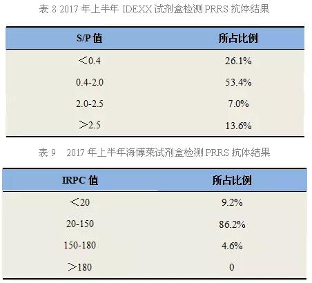 1.3、猪繁殖与呼吸综合征病毒抗体检测 送检PRRSV主要目的一个是监测群中是否有PRRSV野毒感染,另一个是评价猪群免疫抗体是否达标。2017年上半年PRRSV的阳性率为84.2%。使用IDEXX试剂盒检测的样品中S/P值高于2.5的样品占比13.6%(见表8);使用海博莱的试剂盒检测的样品中IRPC值大于150占比4.6%,未出现IRPC值大于180的情况(见表9)。在目前PRRSV的频繁变异高压下,需要根据本场背景,合理使用疫苗并通过免疫优化,使PRRSV在猪群中处于稳定状态。