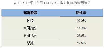 1.4、猪口蹄疫抗体检测 2017年上半年检测的猪O型口蹄疫抗体的阳性率为75.4%。对有明确背景信息的样品的检测结果进行了统计,阳性率为65.6%,免疫效果尚可,但还需进一步提高结果见表10。结果显示,种猪和商品猪的抗体阳性率均较低,均未超过70%,免疫效果有待提升。