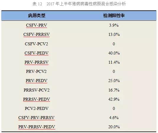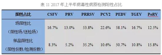 2、病原检测 2.1、病毒病检测 2017年上半年主要进行PRV、PRRSV、PCV2、PEDV、TGEV、PoRV等15种病毒性病原的检测,其中阳性占比较高的病原为PRRSV 、PEDV和PCV2(见表11)。通过基因测序对PRRSV阳性的部分样品进行进一步鉴定,其中PRRSV经典株阳性样品占8.3%,PRRSV高致病性阳性样品占16.7%,PRRSV 类NADC30阳性样品占75.0%,但由于目前猪场免疫的大部分为活疫苗,特别是高致病性猪蓝耳病疫苗,大部分缺乏可实施的鉴别诊断方法,无法确定检出的病原是疫苗毒还是野毒,因此其临床意义还有待商榷。从病原检测情况看,PEDV是检测结果阳性率最高的病毒病,说明病毒性腹泻还是影响猪场生产的主要疫病。PCV2抗原的高检出率可能对猪群免疫状态造成影响,需引起牧场和从业者的高度关注。