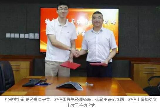 8月2日,挑战牧业与农信蛋联签订战略合作协议。挑战集团常务副总裁、挑战牧业总经理卢红卫、农信蛋联总经理薛峰代表双方签订合作协议,双方将在农信商城、禽蛋交易、金融保险服务等方面展开全面深入的合作。