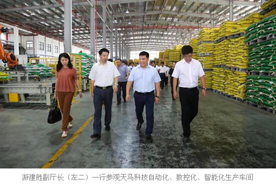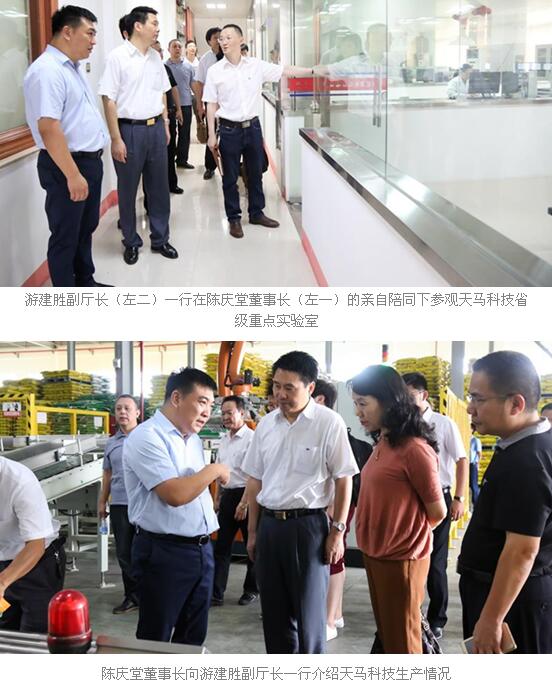游建胜副厅长观看了天马科技荣誉及发明专利成果展示墙,对天马科技重视自主创新、科技兴业取得的发展成就表示肯定,高度赞扬了天马科技不断提高科研水平和经费投入、重视建设产品可追溯体系、注重产品研发和品质提升等工作。